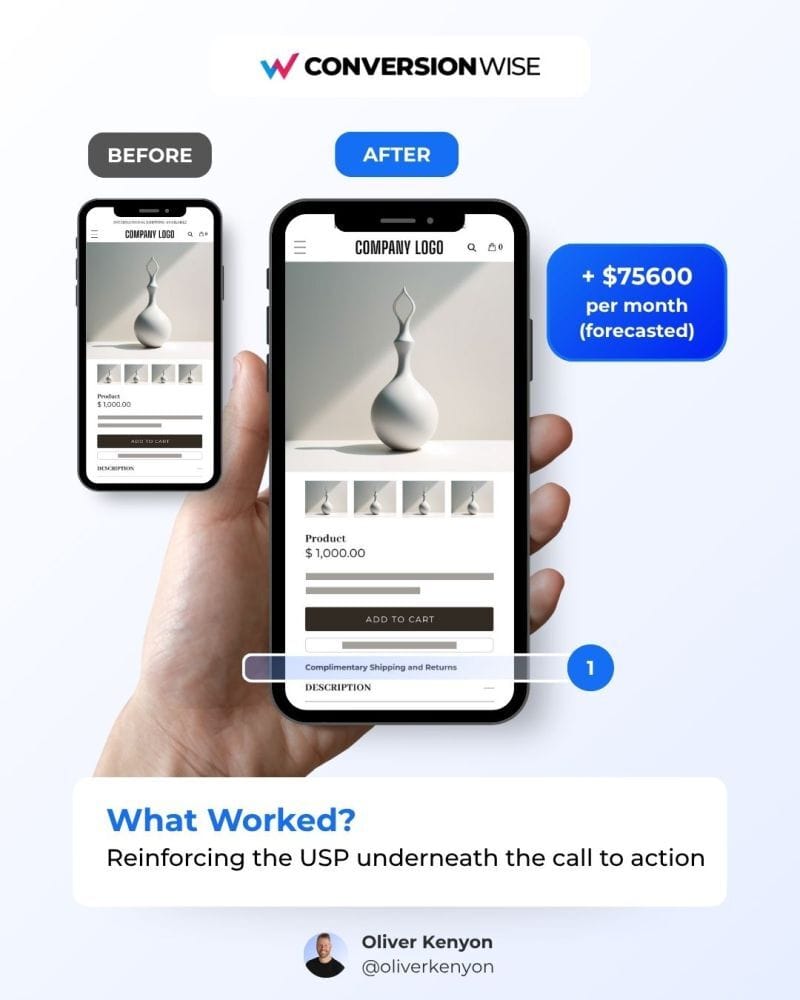 A test showed that reinforcing the product’s USP directly beneath the CTA increased conversions for high-ticket items.