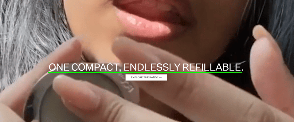 It features an endless loop video of people using the refillable compact, showcasing their product in action with a 4-word long copy.