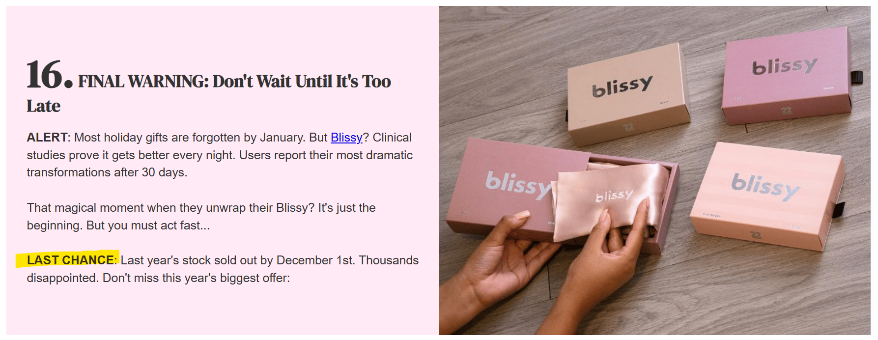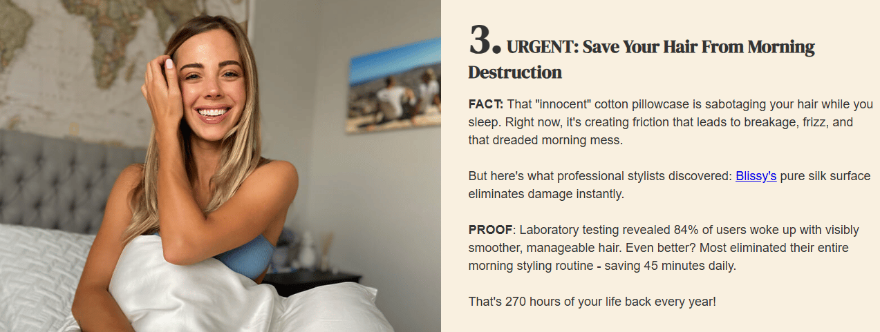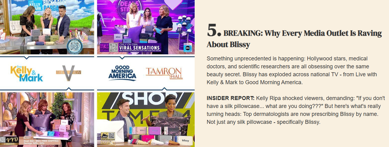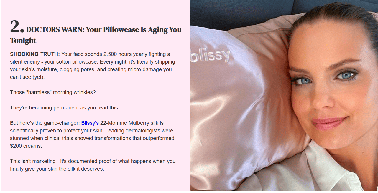 Blissy does not lead with silk or comfort. They lead with outcomes like hair and skin benefits, gifting, and travel.