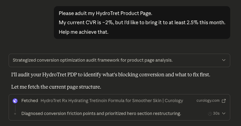 In the paid section, I’ll show you exactly how to build this inside Claude, step by step, so you can run the same kind of diagnosis on your own homepage, PDPs, landing pages, cart, or checkout, without rewriting context every time or drowning in CRO tools.