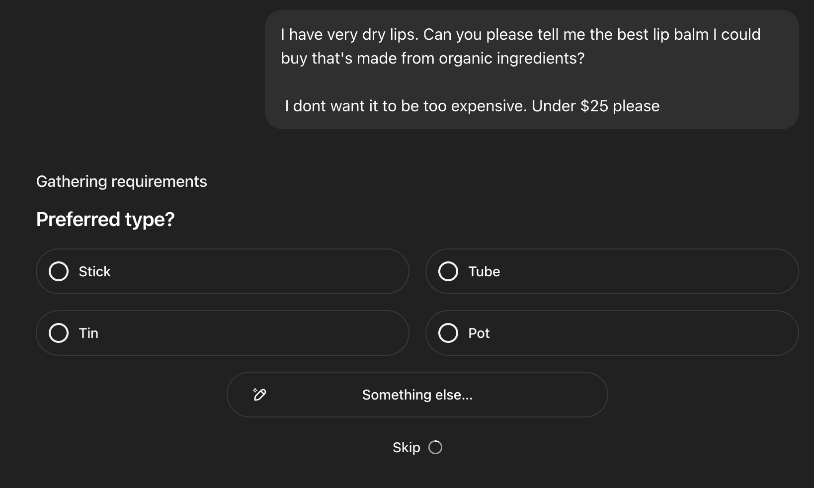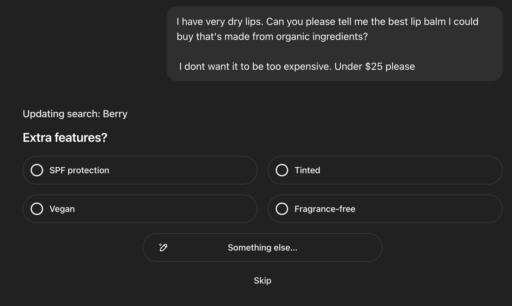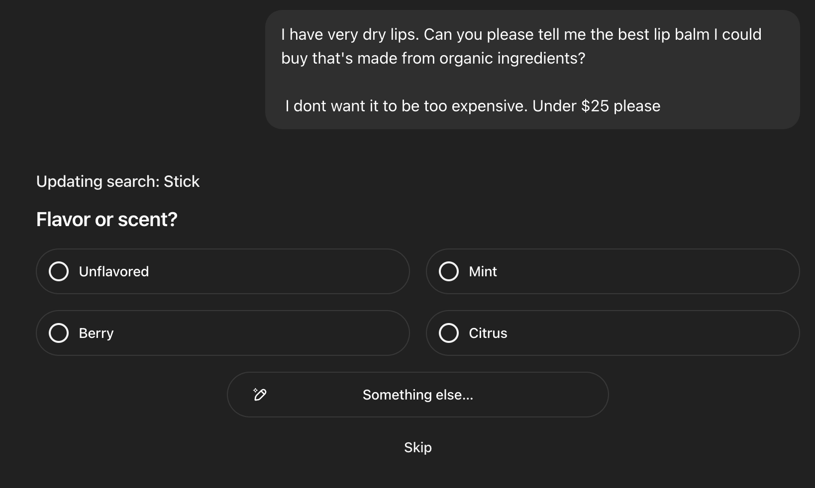 When I asked ChatGPT to find an organic lip balm under $25, it didn’t immediately recommend products.
