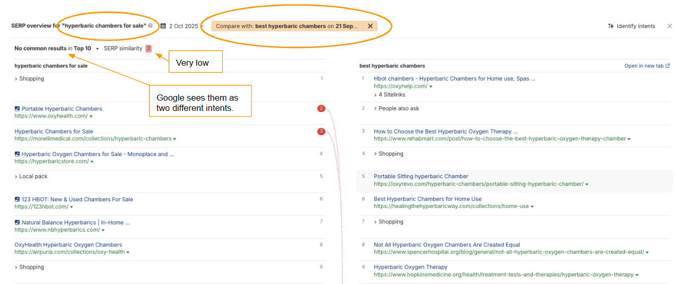 For hyperbaric chambers for sale, the top-ranking pages are all ecom sites selling products.