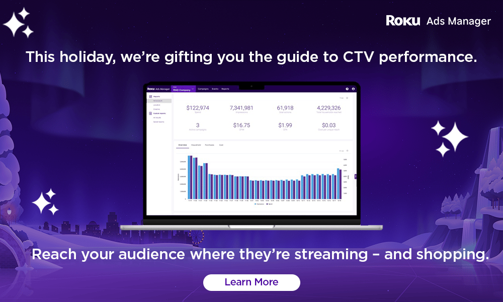 Peak streaming time continues after Black Friday on Roku, with the weekend after Thanksgiving and the weeks leading up to Christmas seeing record hours of viewing. Roku Ads Manager makes it simple to launch last-minute campaigns targeting viewers who are ready to shop during the holidays. Use first-party audience insights, segment by demographics, and advertise next to the premium ad-supported content your customers are streaming this holiday season.